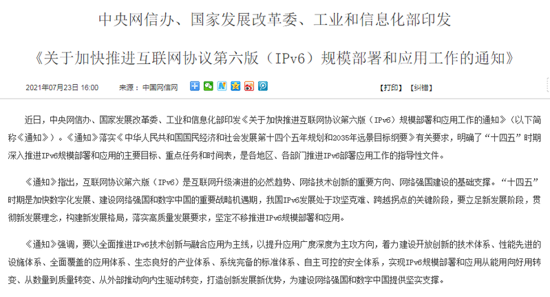 近日,中央網信辦、國家發展改革委、工業和信息化部印發《關于加快推進互聯網協議第六版(IPv6)規模部署和應用工作的通知》(以下簡稱《通知》)。《通知》落實《中華人民共和國國民經濟和社會發展第十四個五年規劃和2035年遠景目標綱要》有關要求,明確了“十四五”時期深入推進IPv6規模部署和應用的主要目標、重點任務和時間表,是各地區、各部門推進IPv6部署應用工作的指導性文件?!锻ㄖ分赋觯ヂ摼W協議第...