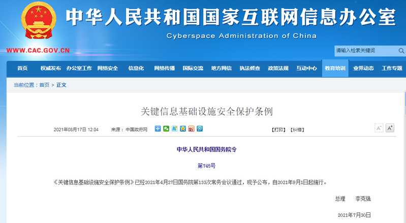 中華人民共和國國務院令第745號《關鍵信息基礎設施安全保護條例》已經2021年4月27日國務院第133次常務會議通過,現予公布,自2021年9月1日起施行。總理 李克強2021年7月30日關鍵信息基礎設施安全保護條例第一章 總 則第一條 為了保障關鍵信息基礎設施安全,維護網絡安全,根據《中華人民共和國網絡安全法》,制定本條例。第二條 本條例所稱關鍵信息基礎設施,是指公共通信和信息服務、能源、交...